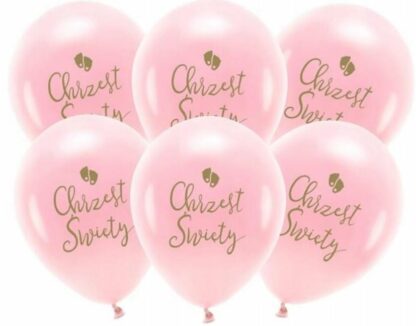Balony pastelowe w kolorze rumianoróżowym ze złotym dwustronnym nadrukiem Chrzest Święty.