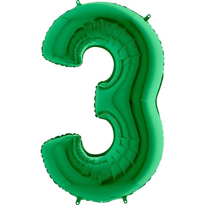 Foliowy balon w kształcie cyfry “3”, w kolorze zielonym.