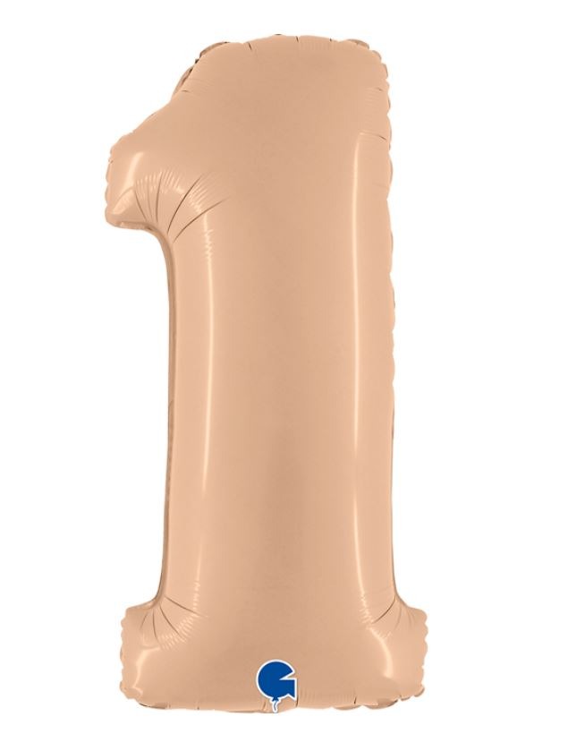 Foliowy balon w kształcie cyfry “1”, w modnym cielistym kolorze z wykończeniem satynowym.