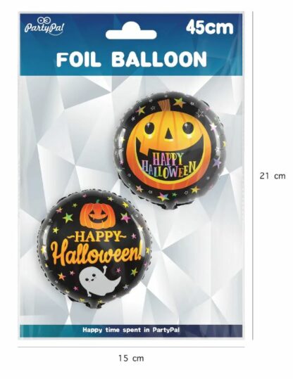 Ten balon foliowy ma różne grafiki po obu stronach. Po jednej stronie znajduje się duża pomarańczowa dynia, która w uśmiechniętej buzi ma kolorowy napis Happy Halloween. Po drugiej stronie napisowi towarzyszą mały duszek i dynia. Czarne tło i kolorowe gwiazdki sprawiają, że na balonie dużo się dzieje. A dzieci to lubią.
