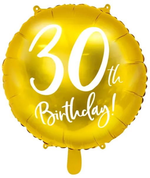Balon foliowy metalizowany, okrągły w kolorze złotym z białym napisem 30th Birthday,