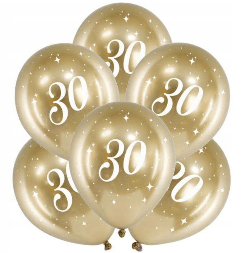 Zestaw sześciu połyskliwych balonów w kolorze złotym z efektownym nadrukiem w postaci liczby 30.