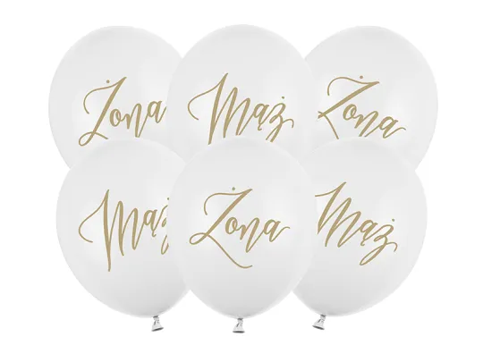 Balony Strong w kolorze Pastel Pure White – białe ze złotym nadrukiem Mąż / Żona.