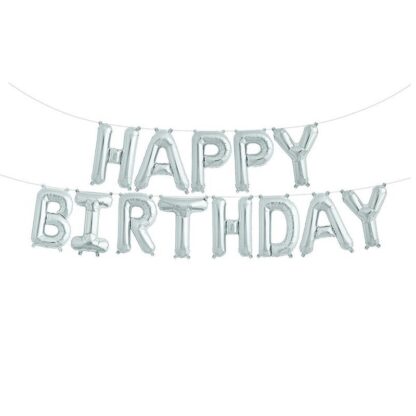 Zestaw foliowych balonów literek, tworzących napis – “HAPPY BIRTHDAY” w błyszczącym i uniwersalnym srebrnym kolorze.