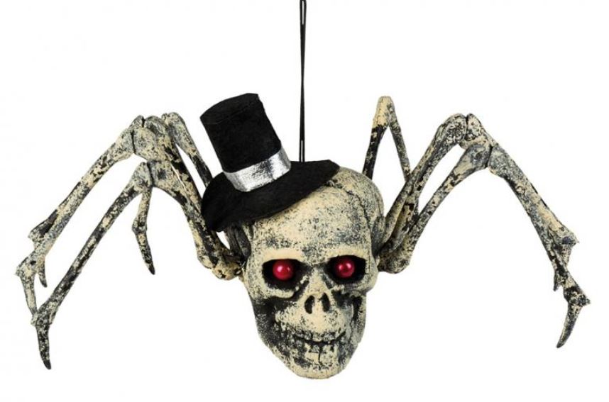 Dekoracja wisząca czaszka z czerwonymi oczami i odnóżami pająka.