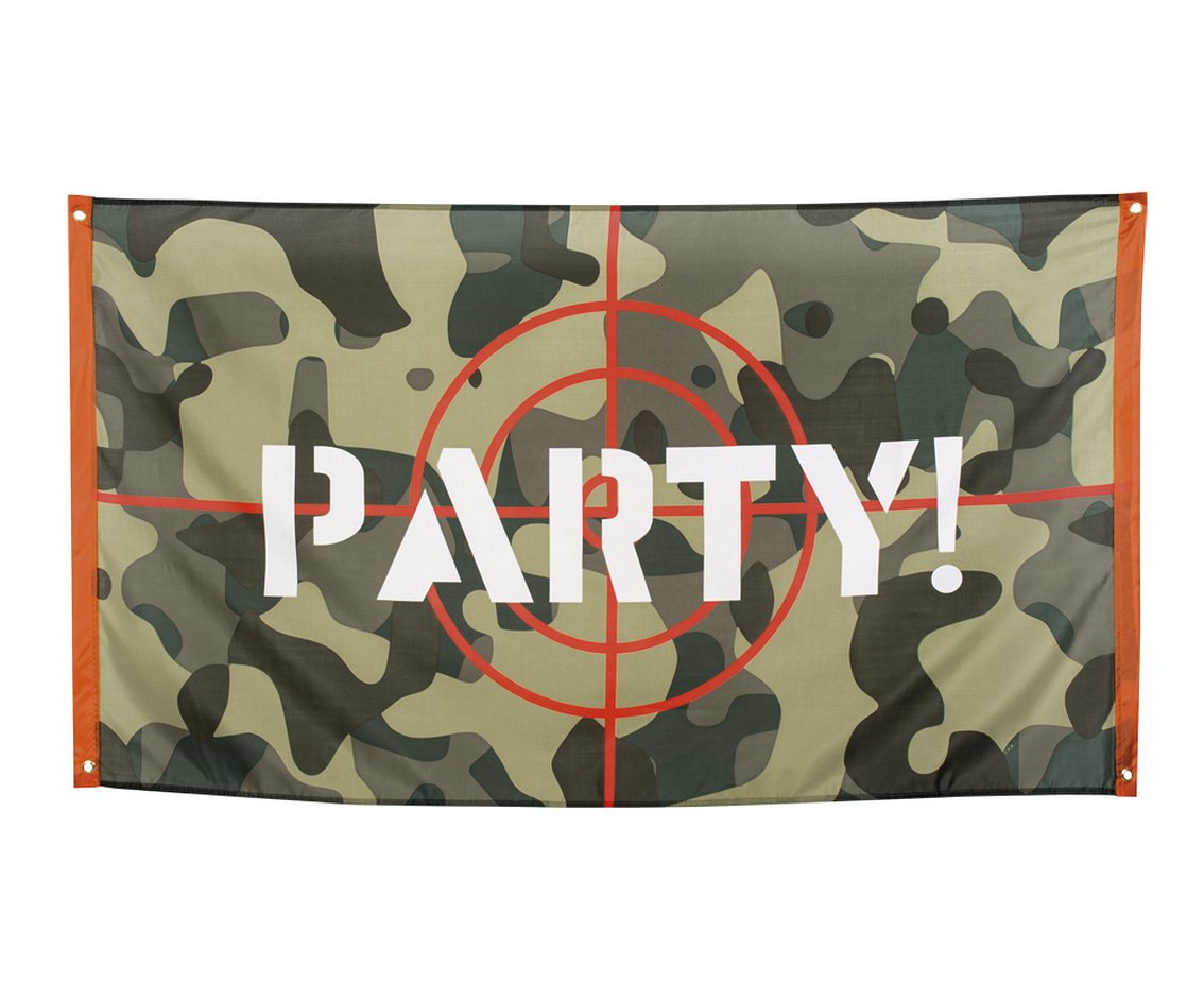 Na fladze czerwony nadruk celownika i duży napis PARTY.
