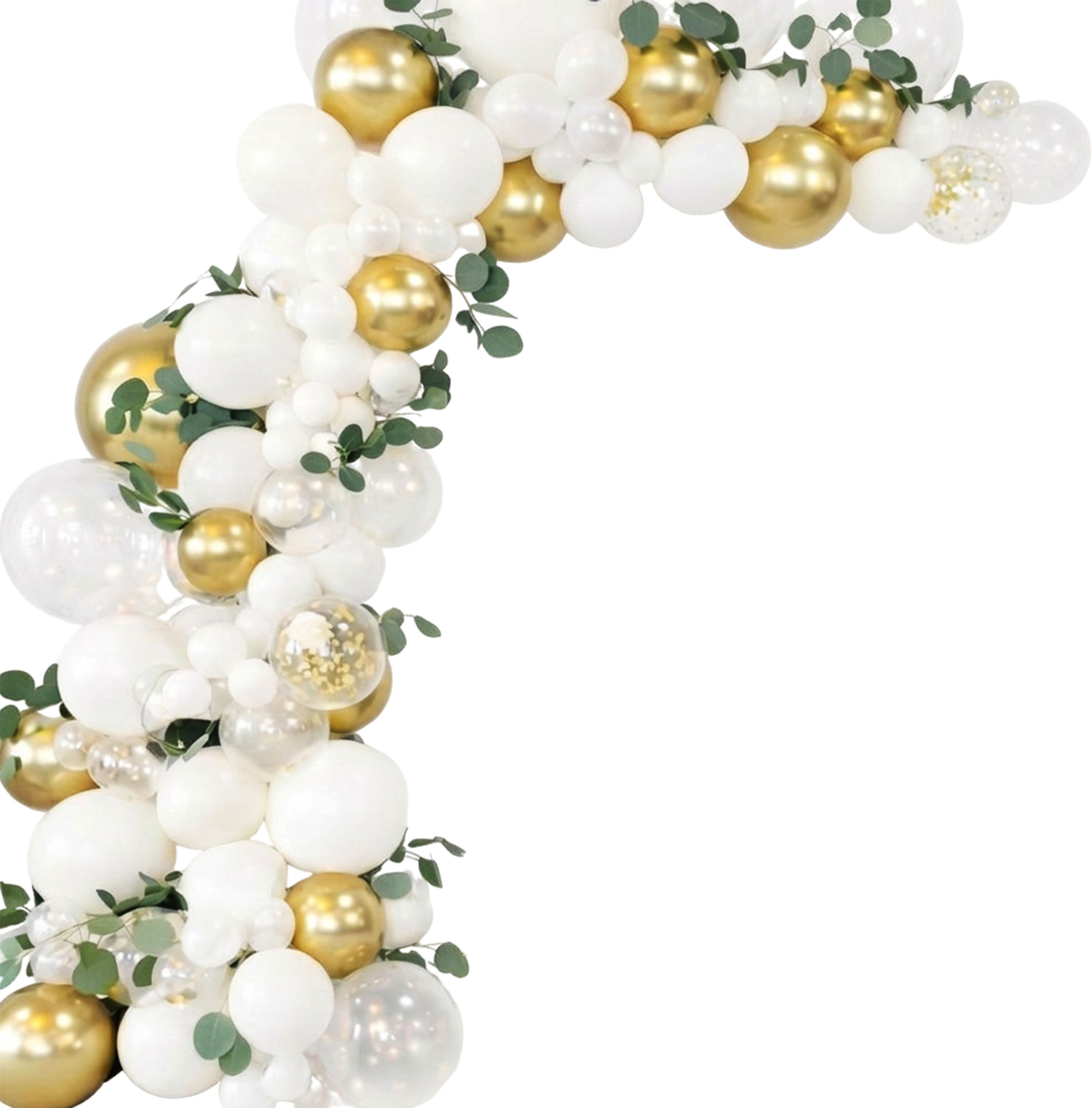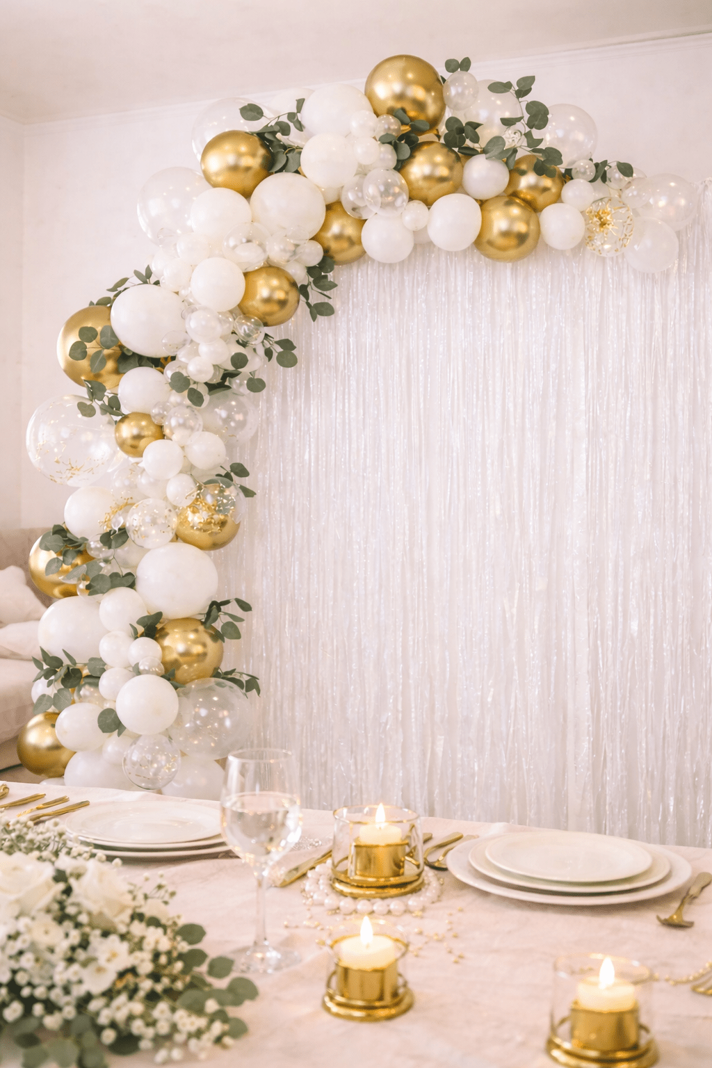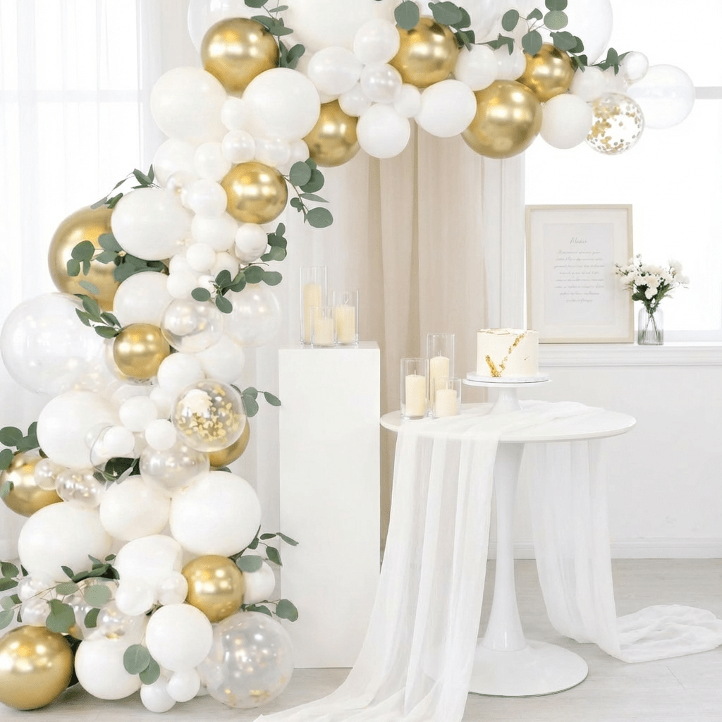 • Kolorystyka: elegancka biel + złoty chrom (premium połysk) + transparentne balony