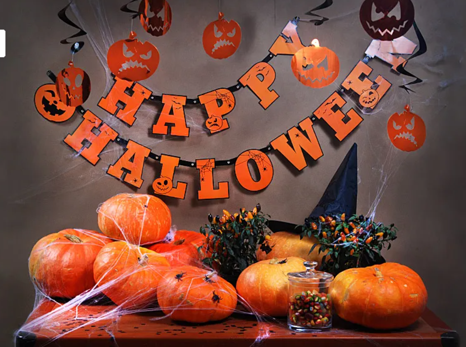 Baner HAPPY HALLOWEEN w kolorystyce pomarańczowo-czarnej.