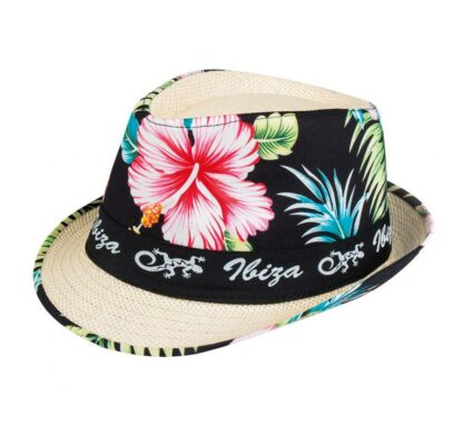 Kapelusz w stylu hawajskim, pokryty nadrukiem kwiatów.
