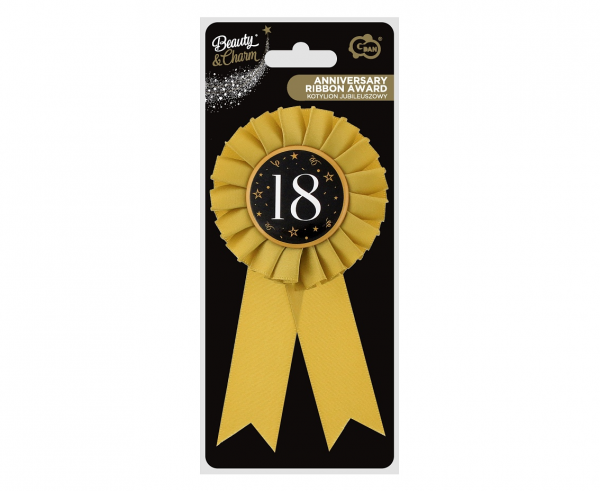 Wewnątrz kotylionu na czarnym tle duże cyfry 18.