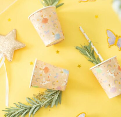 Kubeczki papierowe z motywem księżniczek i jednorożców.