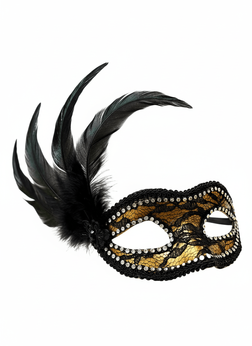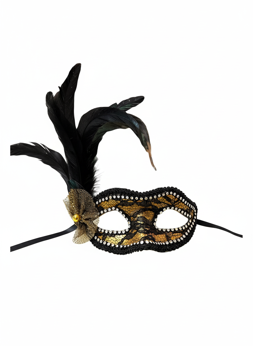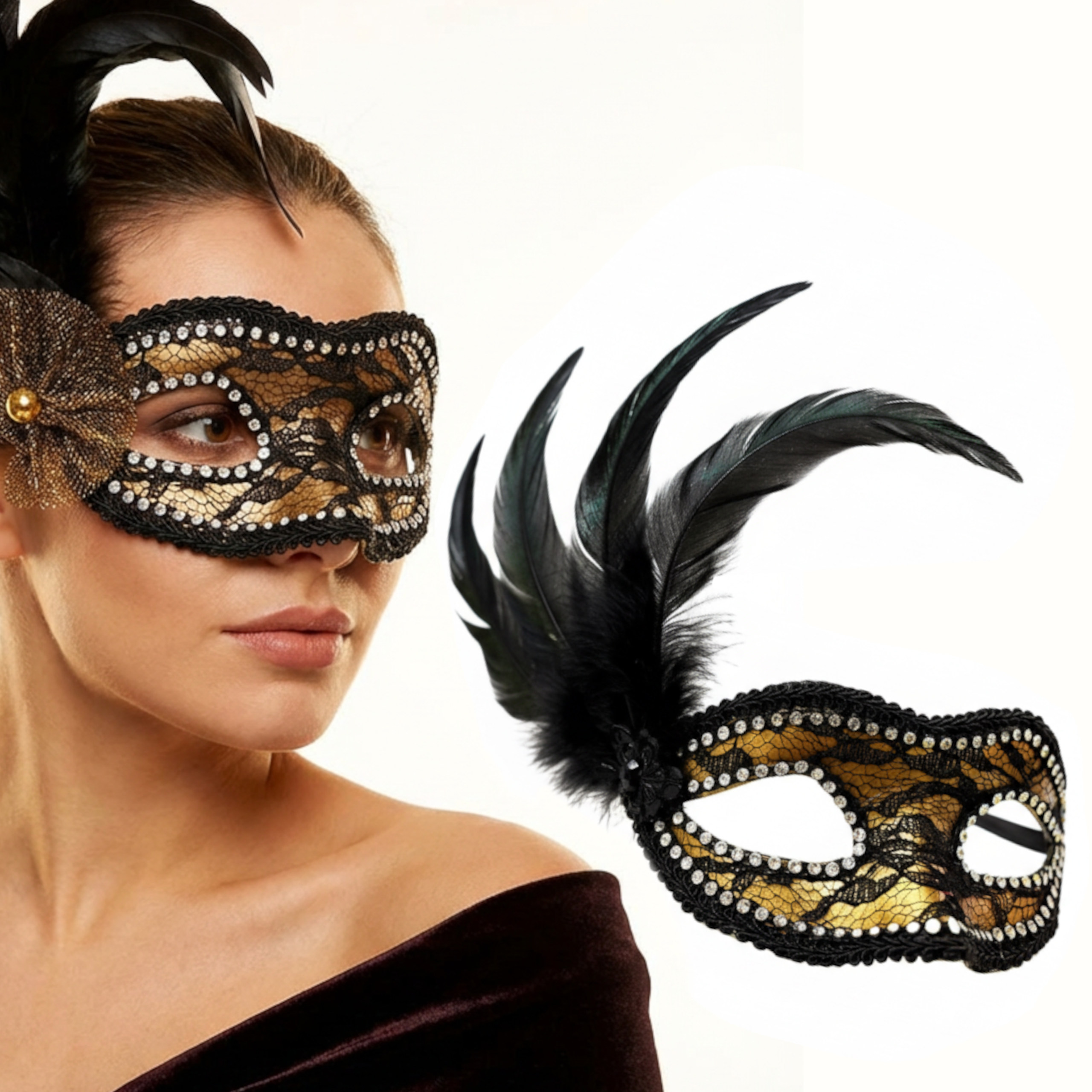 Efektowna maska wenecka z naturalnymi, mieniącymi się piórami to wyjątkowy dodatek, który natychmiast przyciąga spojrzenia. Połączenie czerni, złota, błyszczących zdobień oraz długich piór tworzy spektakularny, teatralny efekt, idealny na bale, Halloween i eleganckie imprezy.