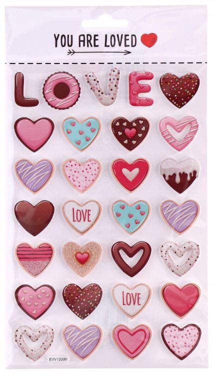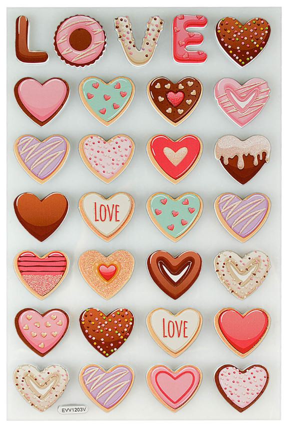 Piankowe naklejki w kształcie serduszek z motywem udekorowanych ciastek.