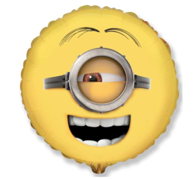 Foliowy, okrągły balon do pompowania powietrzem lub helem. Balon jest w kolorze żółtym z nadrukiem roześmianej buźki Minionka.