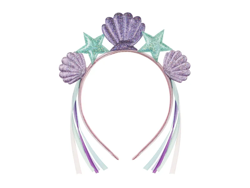 Opaska ma różowy kolor i ozdobiona fioletowymi muszelkami oraz miętowymi rozgwiazdami.