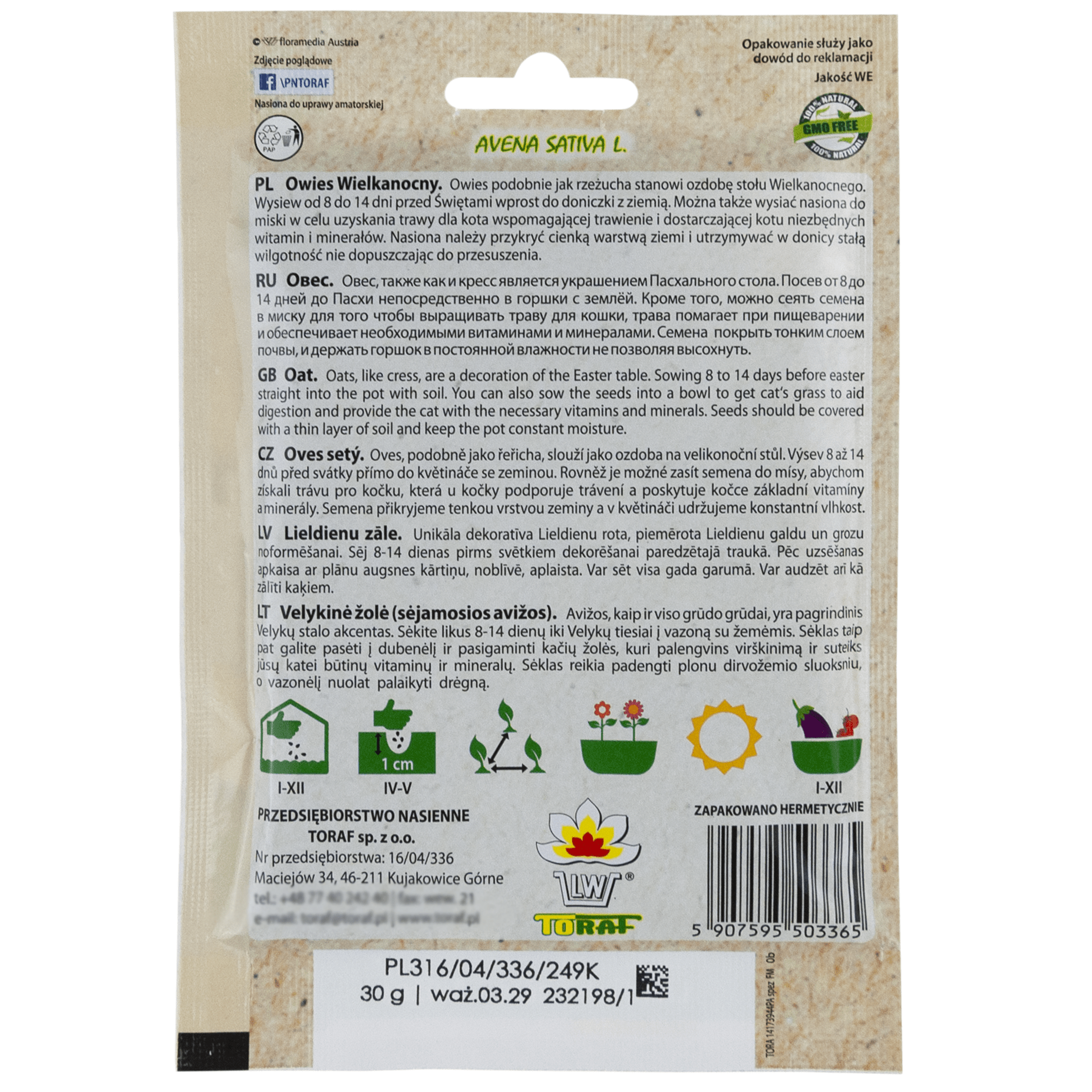 Owies, podobnie jak rzeżucha, stanowi ozdobę stołu Wielkanocnego. Wysiew od 8 do 14 dni przed Świętami wprost do doniczki z ziemią. Można także wysiać nasiona do miski w celu uzyskania trawy dla kota wspomagającej trawienie i dostarczające kotu niezbędnych witamin i minerałów. Nasiona należy przykryć cienką warstwą ziemi i utrzymywać w donicy stałą wilgotność, nie dopuszczając do przesuszenia.
