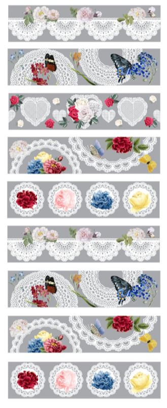 Koronkowe wzory owijek termokurczliwych przełamany wiosennym motywem kwiatów i motyli.