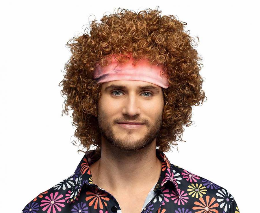 Brązowa peruka kręcona hippis z opaską. Dodatek do stroju hippisa.