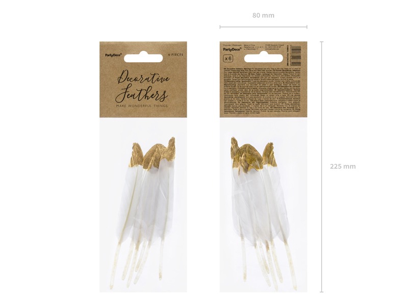 Piórka dekoracyjne w kolorze białym ze złotą metalizowaną końcówką.