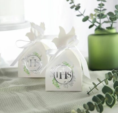 Idealne opakowanie na upominki dla gości komunijnych. Na dwóch ściankach umieszczona została grafika przedstawiająca srebrną hostię z napisem IHS, otoczoną delikatnymi zielonymi i srebrnymi listkami eukaliptusa. Pudełko na prezent do samodzielnego łatwego złożenia.