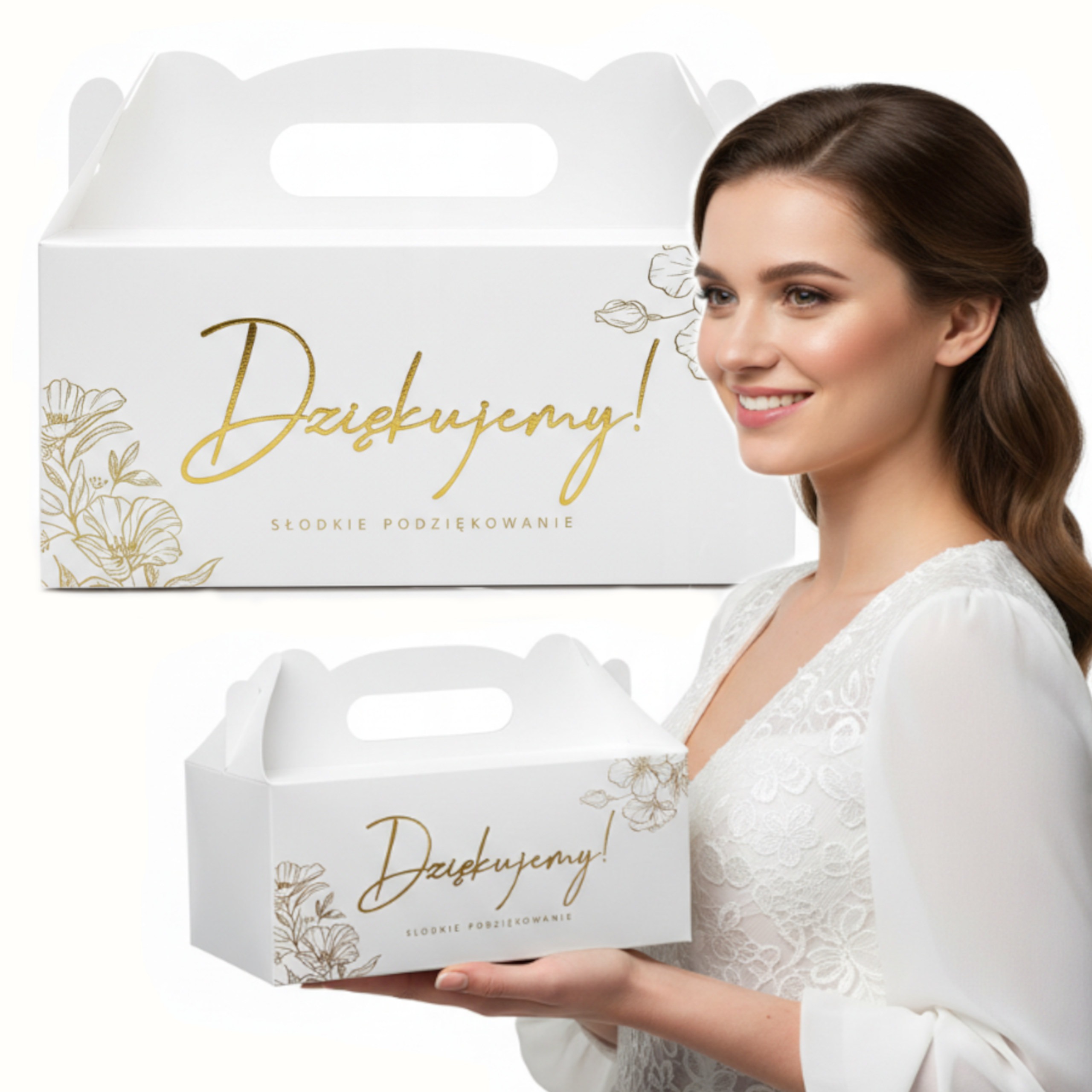 Stylowe, minimalistyczne i niezwykle estetyczne pudełko na ciasto wykonane z białego, gładkiego papieru, zaprojektowane z myślą o eleganckich uroczystościach. Subtelny, złoty napis „Dziękujemy” oraz delikatny motyw florystyczny sprawiają, że opakowanie prezentuje się wyjątkowo luksusowo i pasuje do każdej aranżacji przyjęcia.