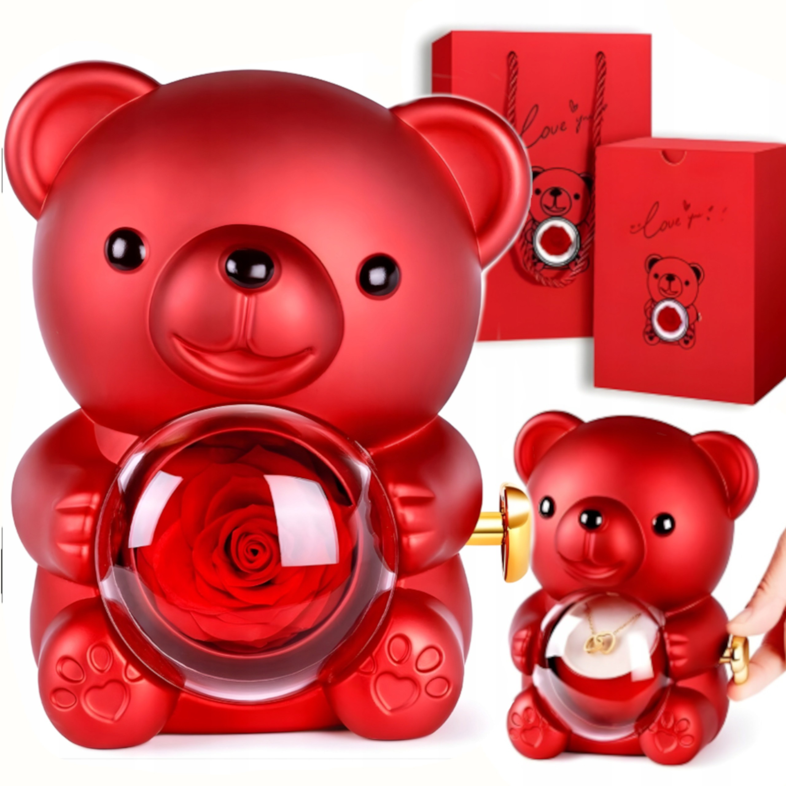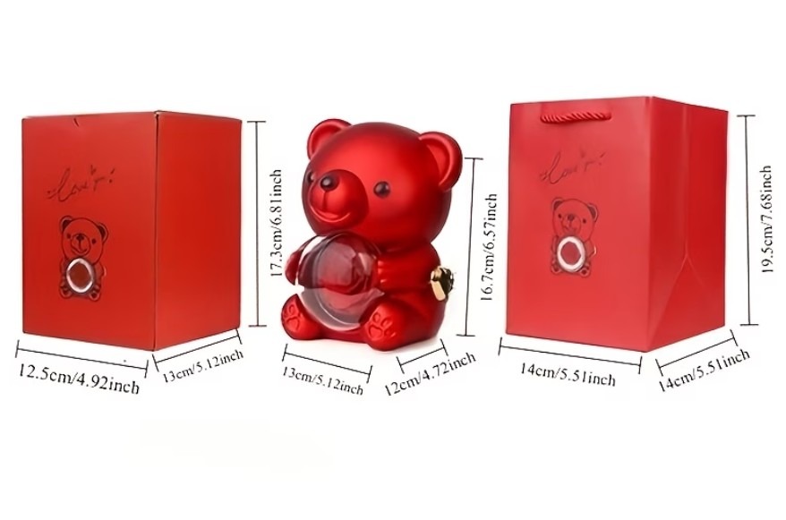 Efektowny miś prezentowy w eleganckim, czerwonym kolorze to wyjątkowy sposób na wręczenie biżuterii lub stworzenie niezapomnianego prezentu. Wewnątrz znajduje się przezroczysta kopuła z dekoracyjną różą oraz ukryta szkatułka, idealna na pierścionek, kolczyki lub naszyjnik. Produkt robi ogromne wrażenie wizualne i doskonale sprawdza się jako prezent „WOW”.
