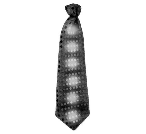 Na odwrocie krawata znajduje się przycisk uruchamiający diody oraz zmieniający częstotliwość ich świecenia.
