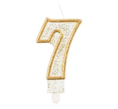Świeczka w kształcie cyfry “7” w kolorze białym ze złotym konturem, wypełniona złotym, połyskującym brokatem.