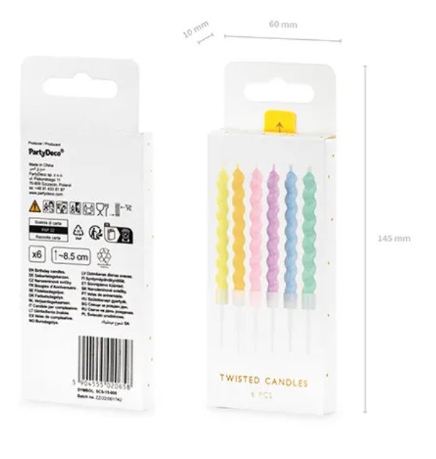 Zestaw zawiera 6 świeczek w pastelowych kolorach: żółtym, różowym, zielonym, niebieskim, pomarańczowym oraz fioletowym, dzięki czemu dekoracja tortu staje się kolorowa, radosna i idealnie pasuje do wielu aranżacji przyjęć urodzinowych.