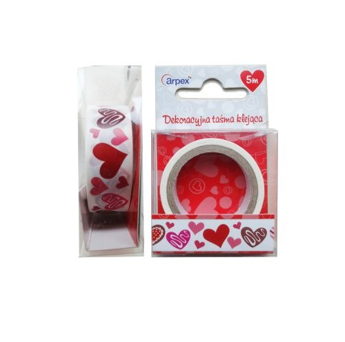 Taśma klejąca biała z motywem czerwonych serduszek.