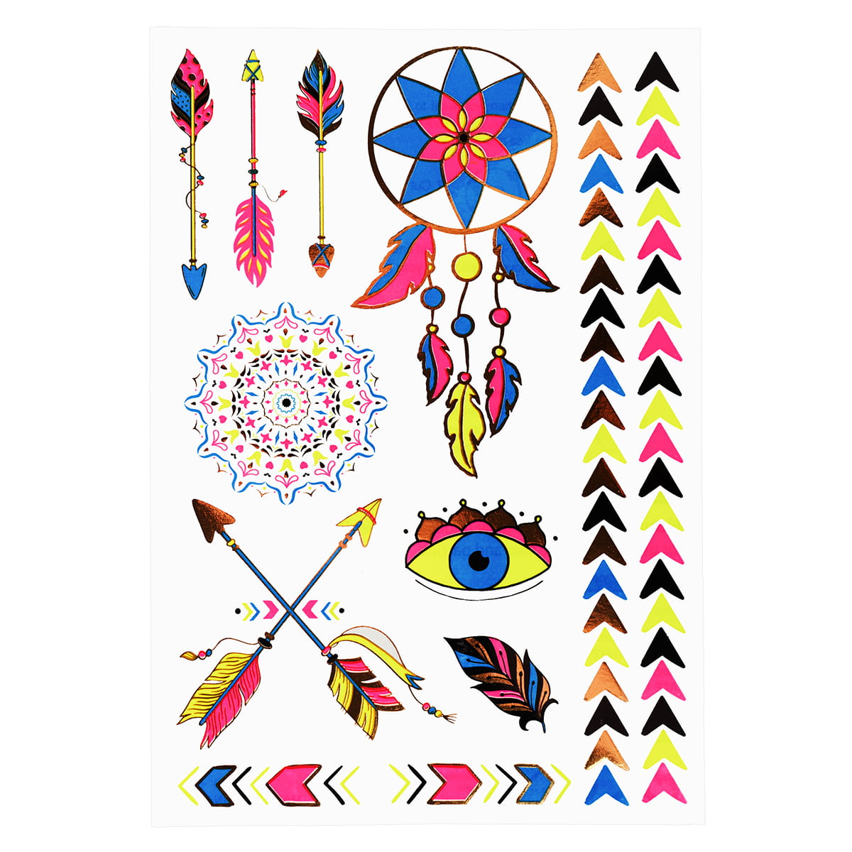 Tatuaże zmywalne na arkuszu o wymiarach 15 x 26 cm.