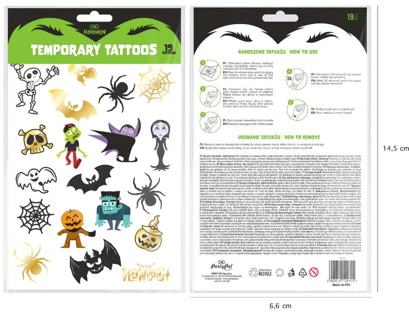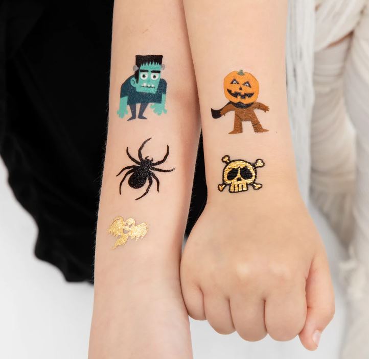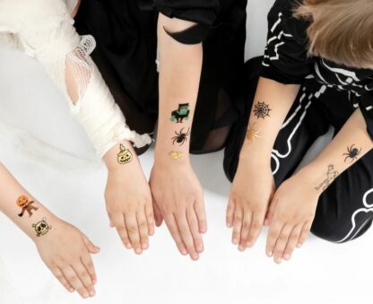 Tatuaże zmywalne idealne na Halloween. Mix wzorów – nietoperzy, kościotrupów i pająków.