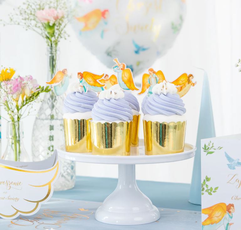Toppery na tort i do babeczek z 6 różnymi aniołkami. Niebanalne kolory i niebanalna kreska rysownika sprawią, że toppery będą jedną z ciekawszych ozdób na uroczyście nakrytym stole.