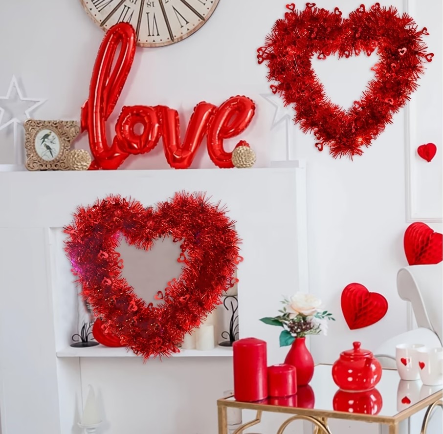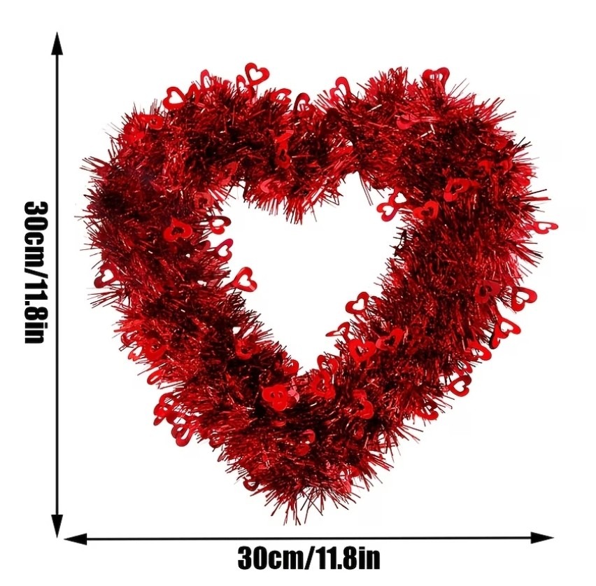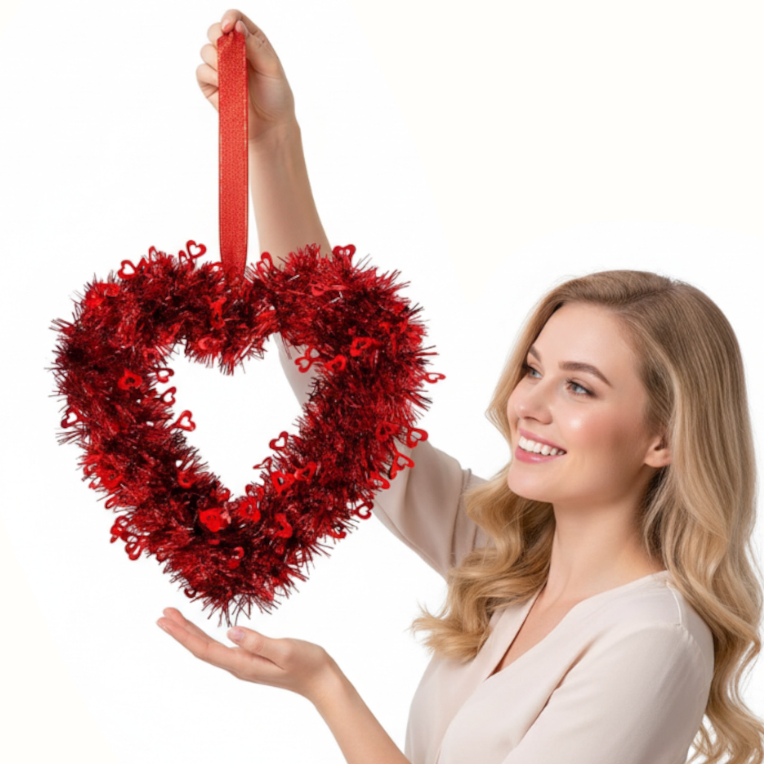Wyjątkowy wianek walentynkowy w kształcie serca, który stanowi gotową dekorację romantyczną na Walentynki, rocznicę, zaręczyny lub romantyczną kolację. Intensywnie czerwony kolor, gęsta błyszcząca lameta oraz liczne dekoracyjne serduszka sprawiają, że wianek jest bardzo widoczny, efektowny i przyciąga uwagę już z daleka.