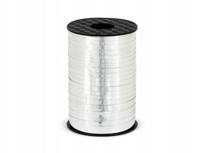Wytrzymała wstążka do balonów w eleganckim połyskującym srebrnym kolorze.