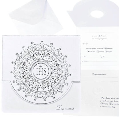 Zaproszenie komunijne wykonane na wysokiej jakości perłowym papierze z pięknymi tłoczeniami w postaci srebrnego ornamentu oraz srebrnych napisów. W górnej części zaproszenia wycięte jest koło dzięki któremu uwidoczniony jest napis “IHS” umieszczony pod spodem.