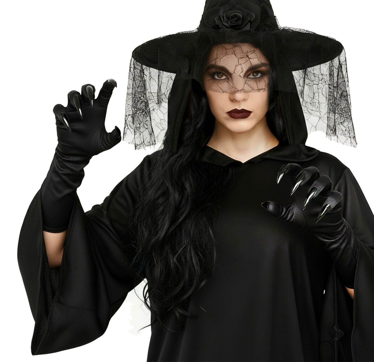 ✅ Efektowna stylizacja – obszerna suknia, kapelusz z woalką i pazury gwarantują, że nikt nie przejdzie obok Ciebie obojętnie.