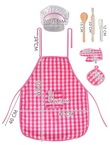 • KOMPLETNY STRÓJ – zestaw składa się z 7 elementów: fartuszka oraz czapki kucharskiej, których można używać nie tylko w zaciszu domowym, ale również doskonale wykorzystać podczas urodzin, zabaw tematycznych lub balów przebierańców.